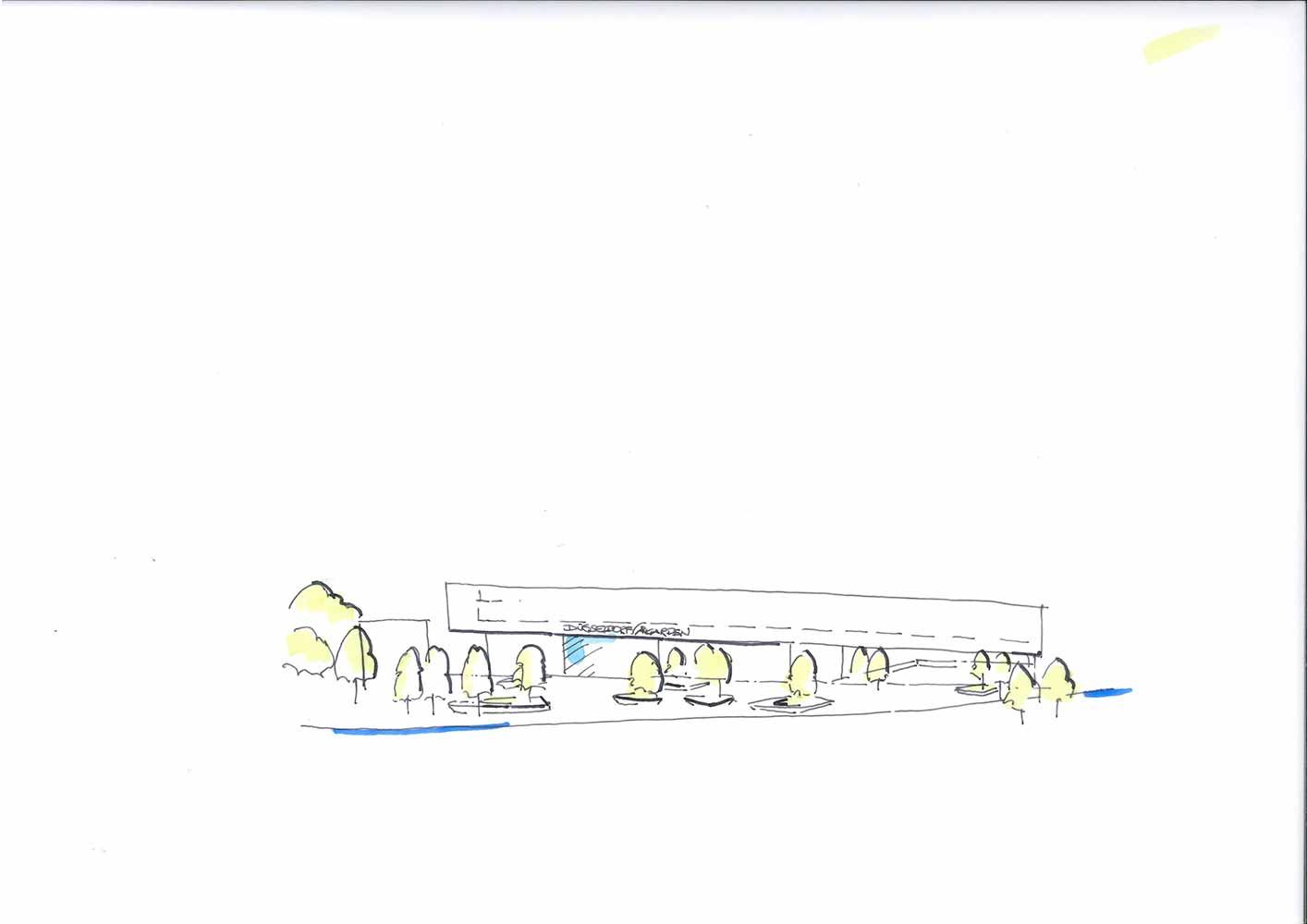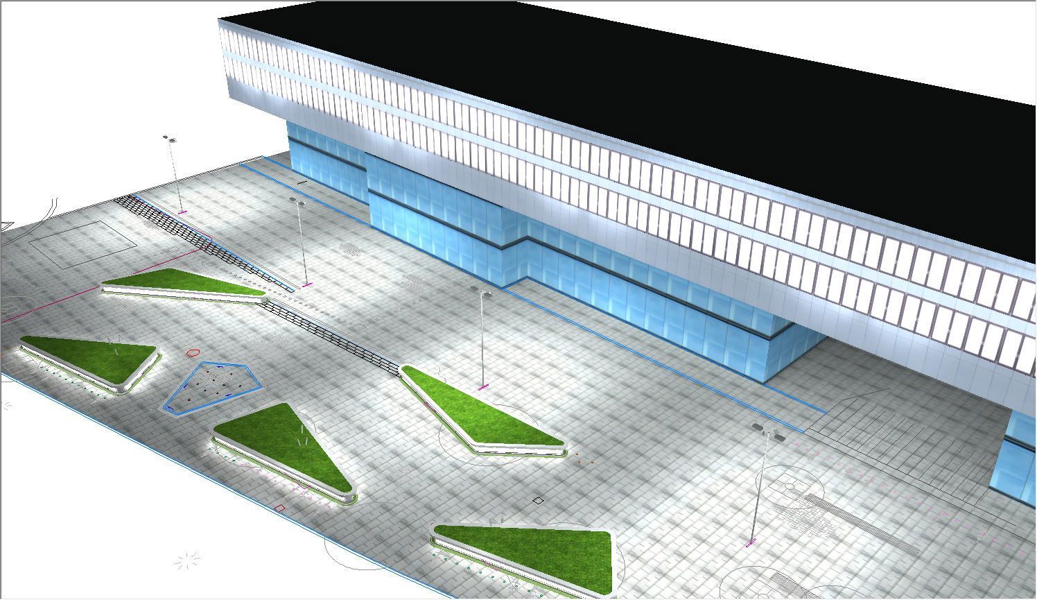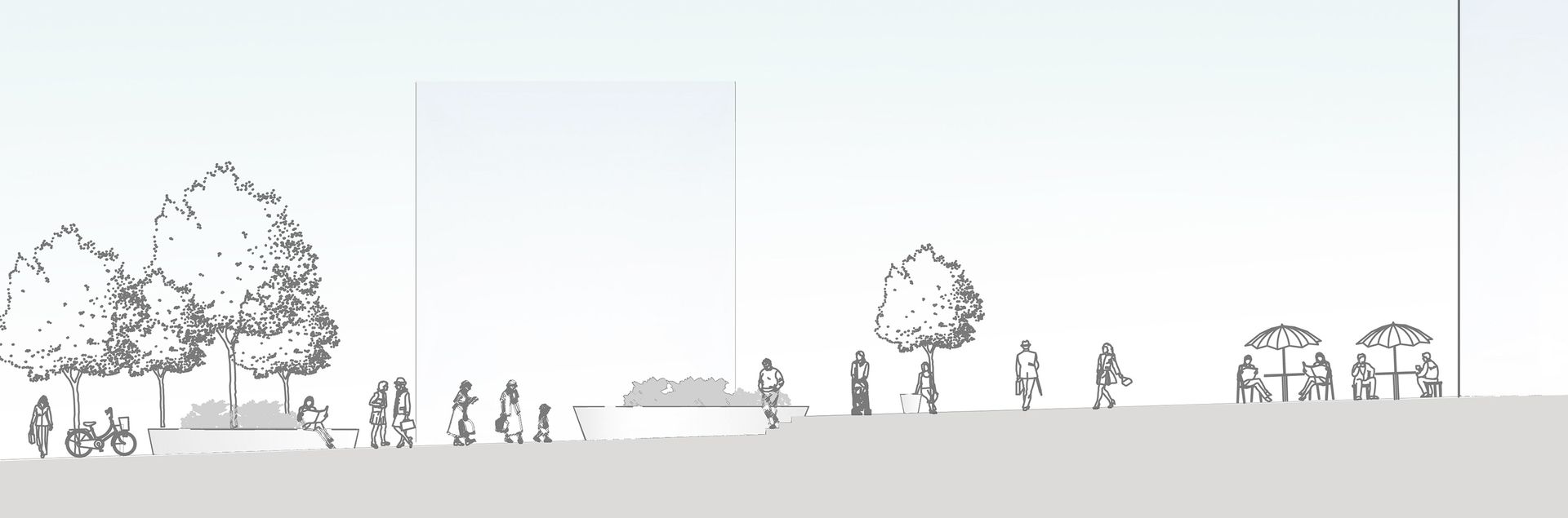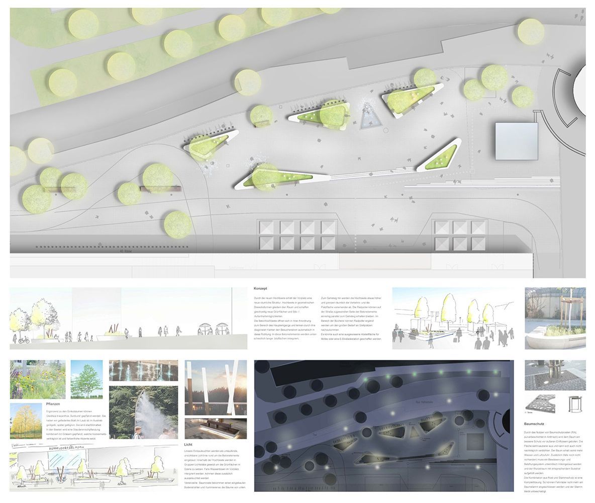 Planung eines klimagerechten Vorplatzes mit besonderem Lichtkonzept und Sprühnebel-Freiluftkühlung.