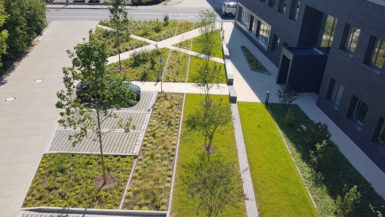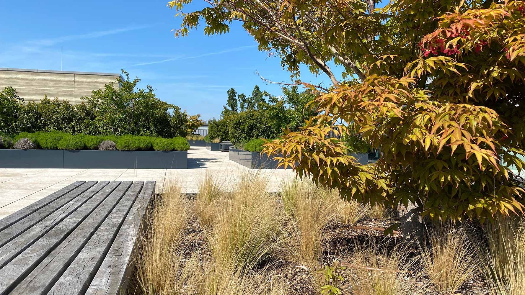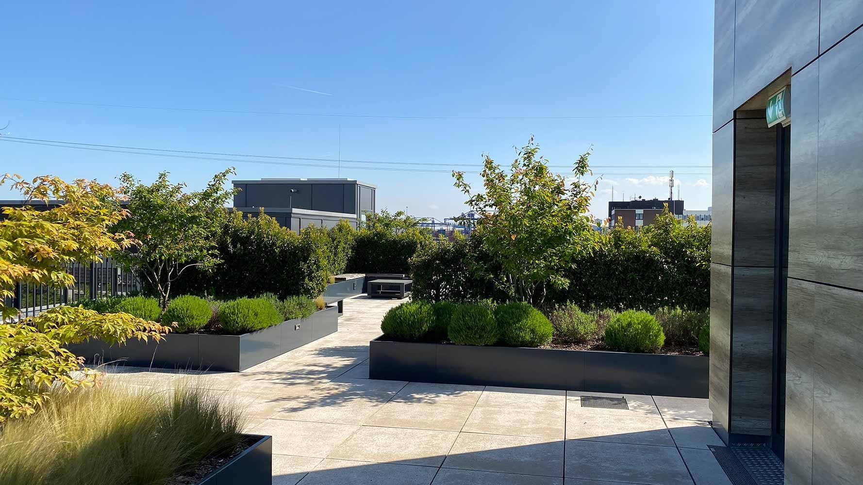 Einladende Eingangs- und Dachgartengestaltung eines Bürogebäudes mit Verweil-, Arbeits- und Ruhezonen für die Mitarbeiter im Freien.