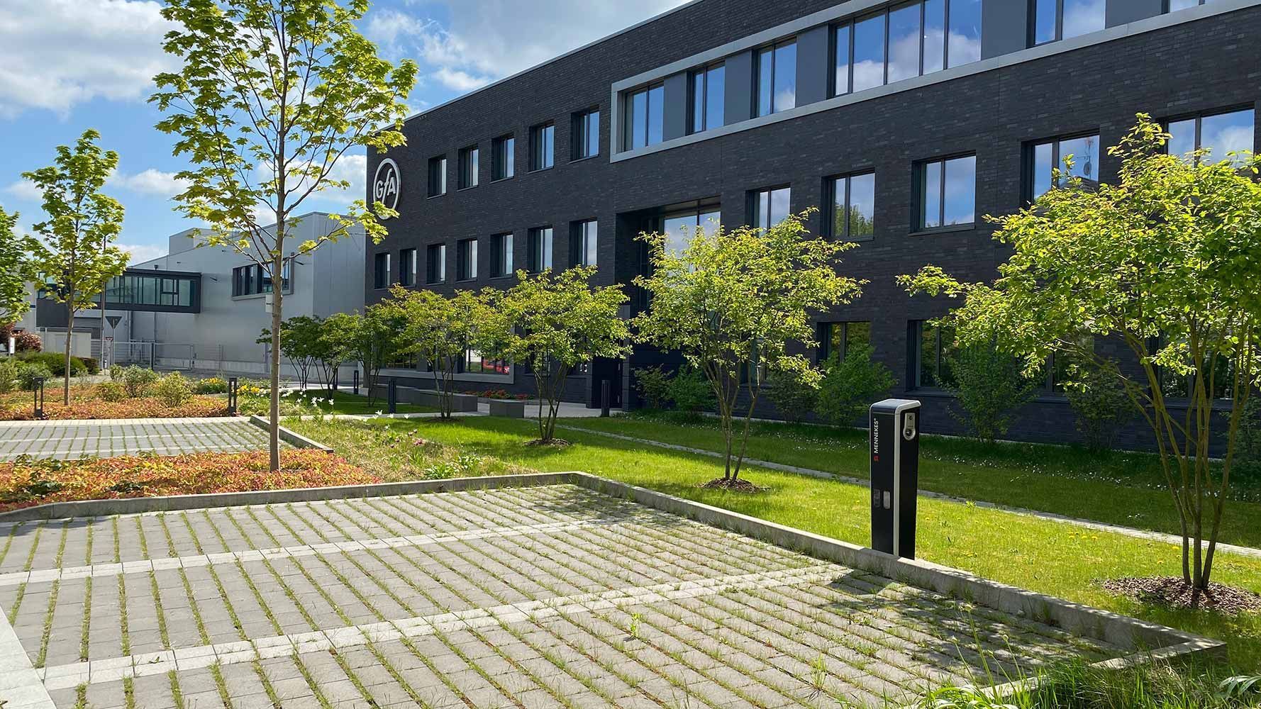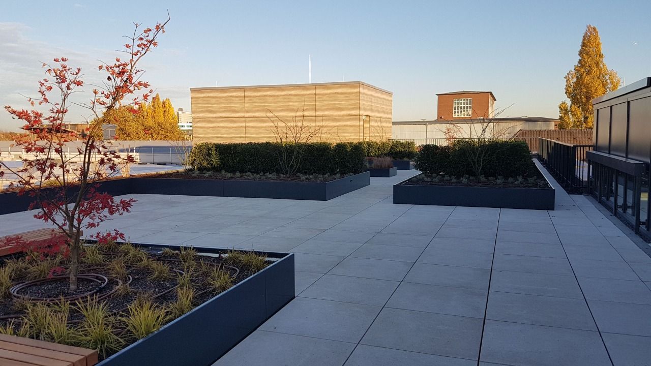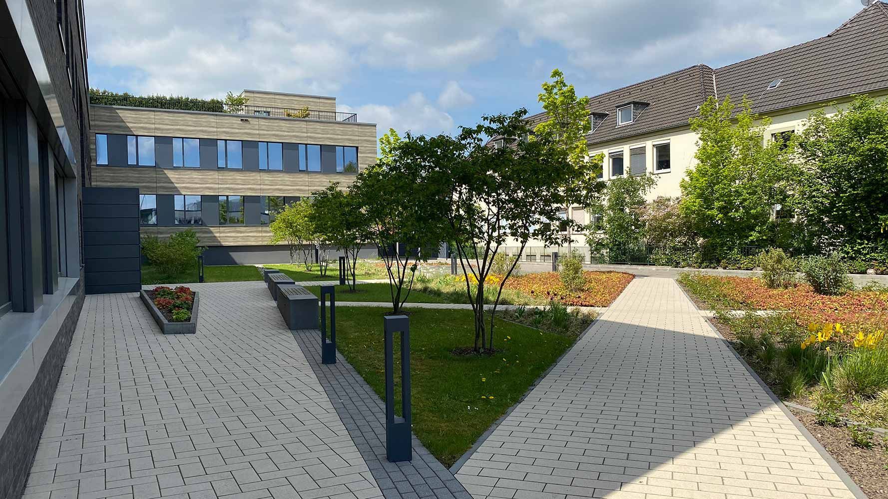 Einladende Eingangs- und Dachgartengestaltung eines Bürogebäudes mit Verweil-, Arbeits- und Ruhezonen für die Mitarbeiter im Freien.