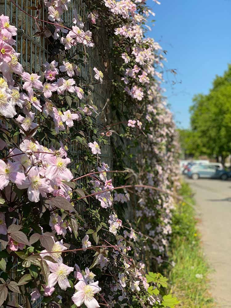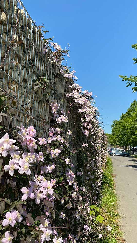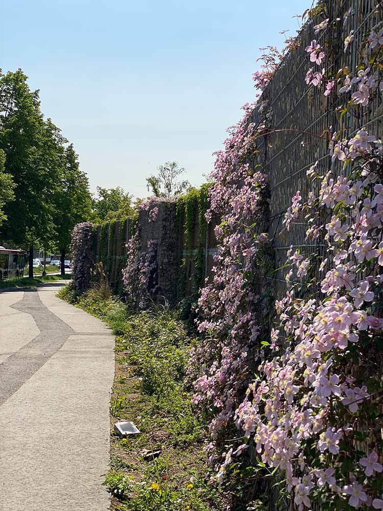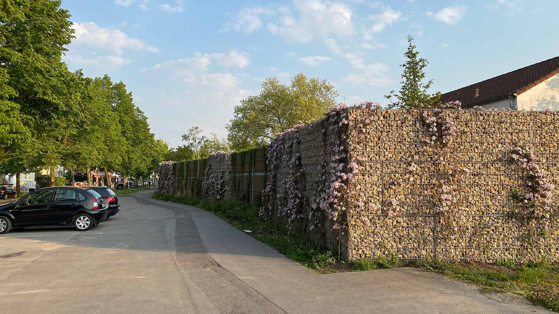 Innerstädtische Lärmschutzwand in Kombination von Gabionen und Schallschutzwänden in einer max. Breite von 18 cm.