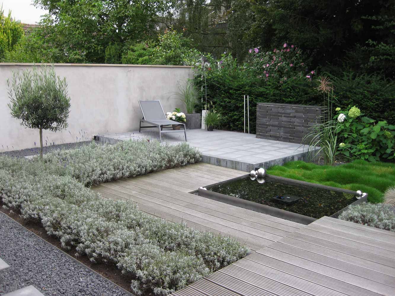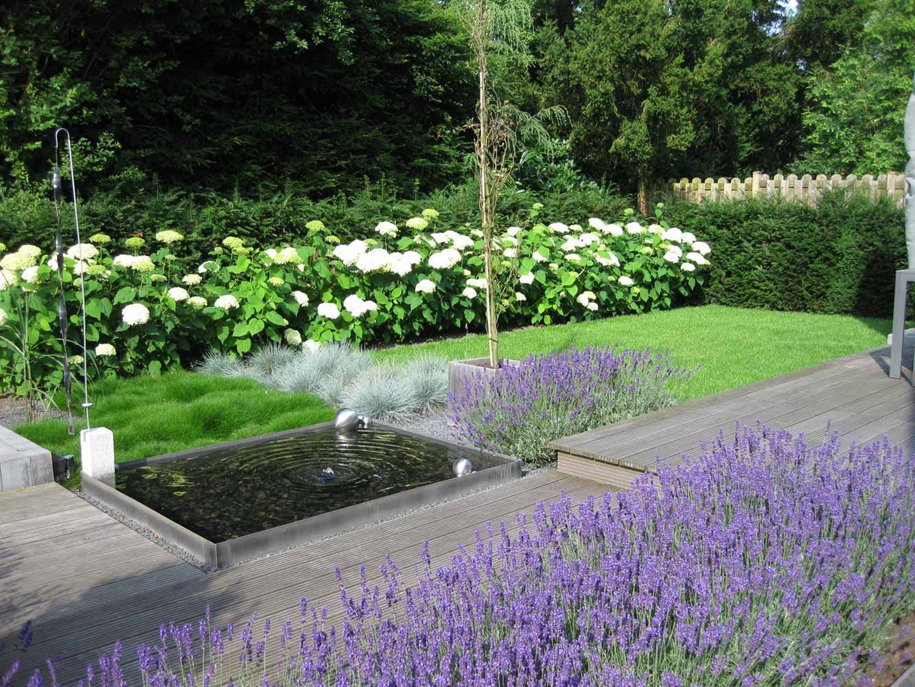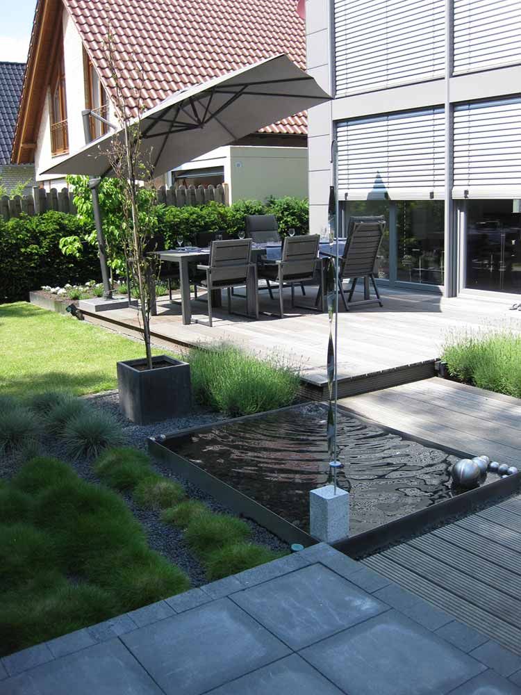 Klare Strukturen mit zentral angelegtem Wasserspiel, zwischen Grill- und Sonnenterrasse. Umrahmt von Gräsern, Anemonen und Lavendel. Durch bewusst gewählte Höhenvorsprünge ist der Garten auf unterschiedlichen Ebenen erlebbar.