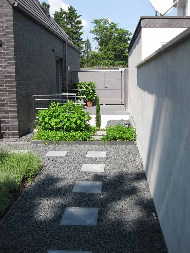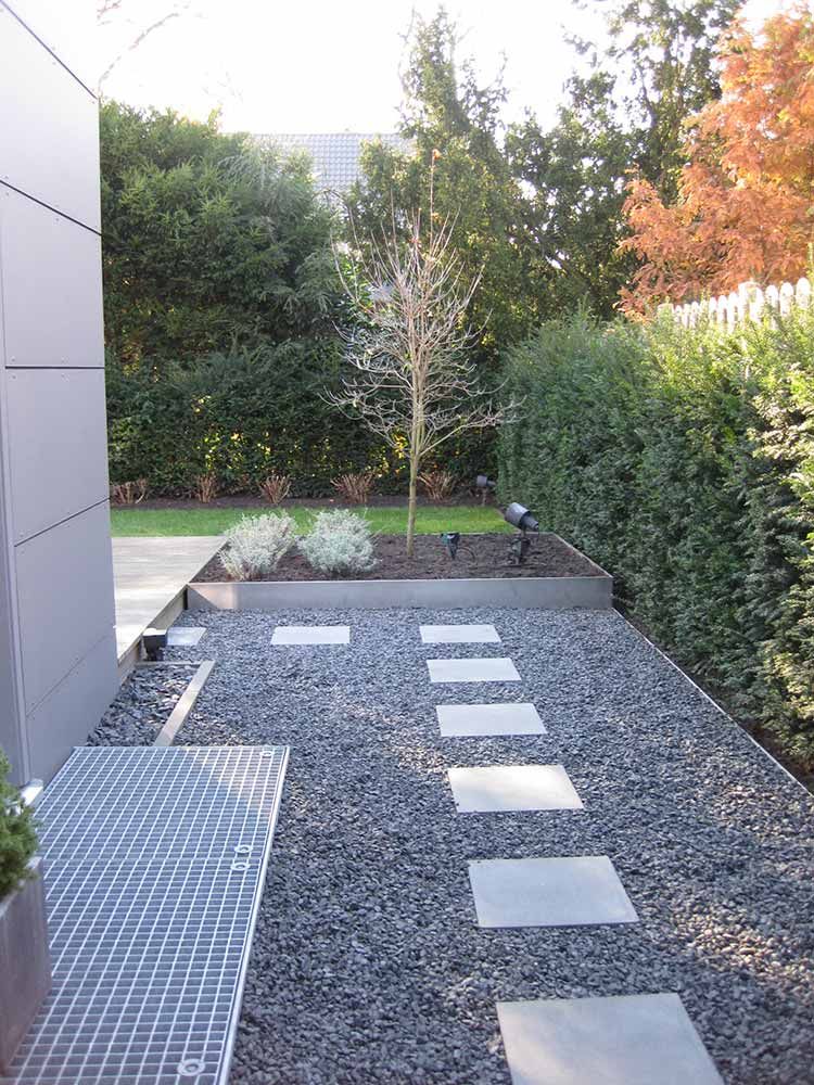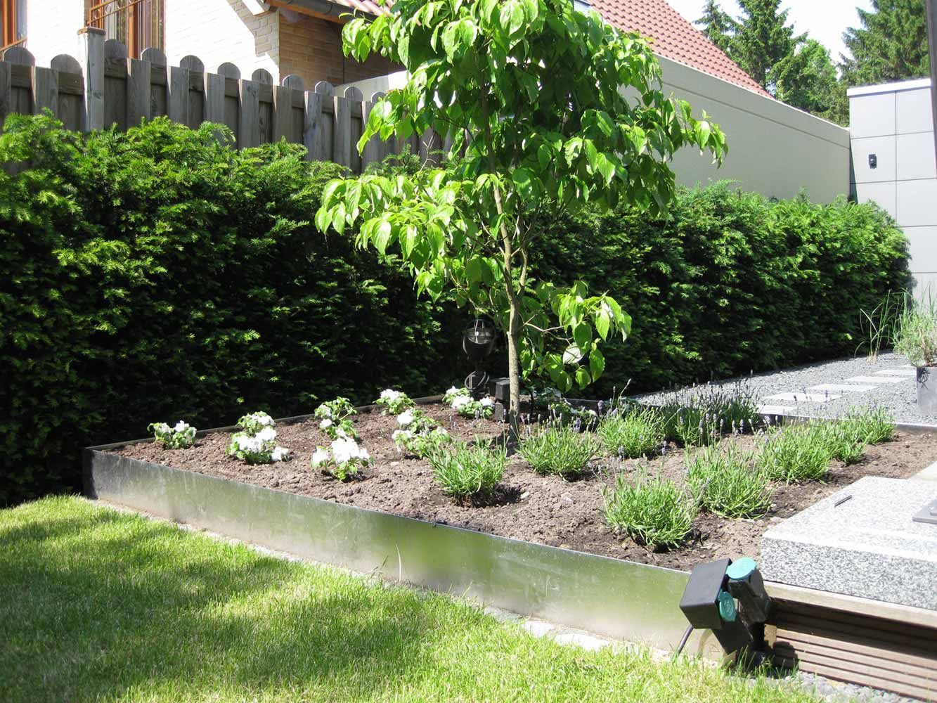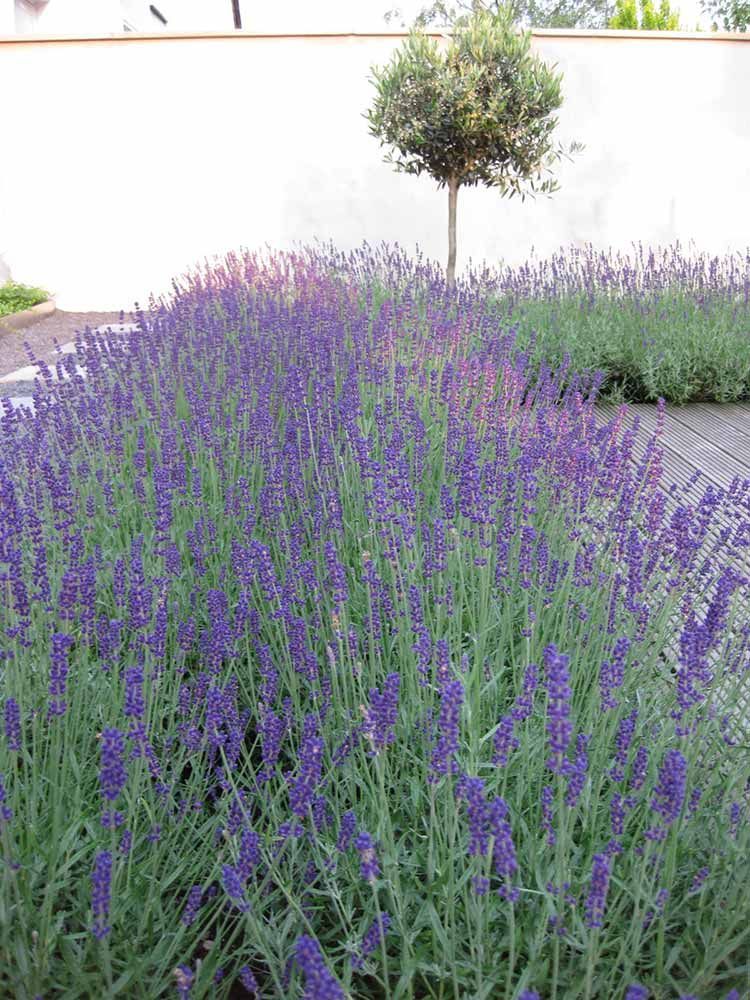 Klare Strukturen mit zentral angelegtem Wasserspiel, zwischen Grill- und Sonnenterrasse. Umrahmt von Gräsern, Anemonen und Lavendel. Durch bewusst gewählte Höhenvorsprünge ist der Garten auf unterschiedlichen Ebenen erlebbar.