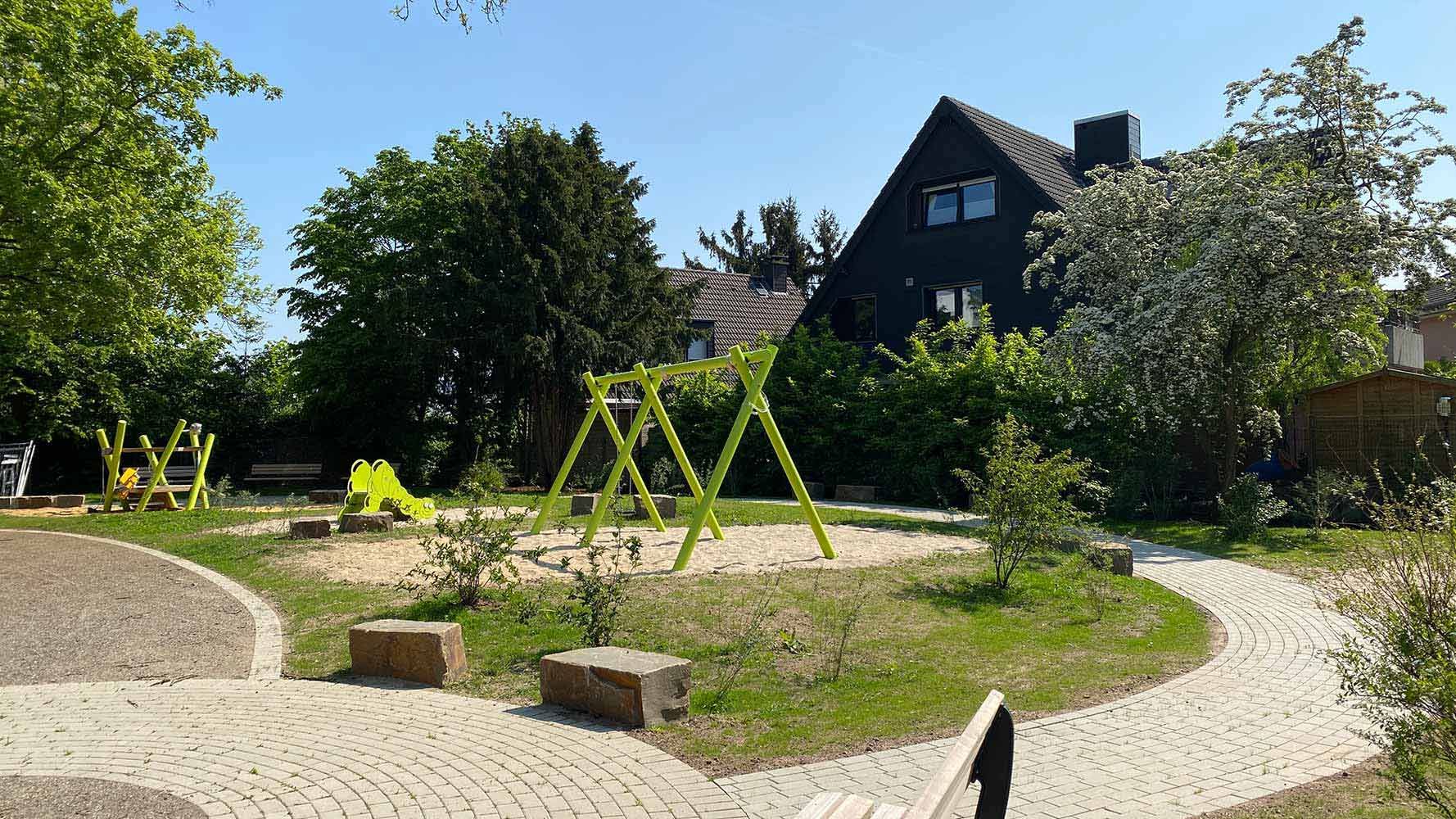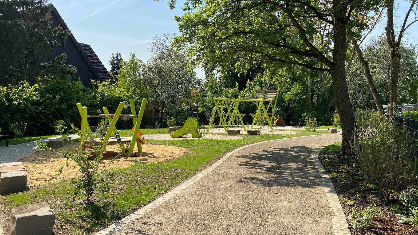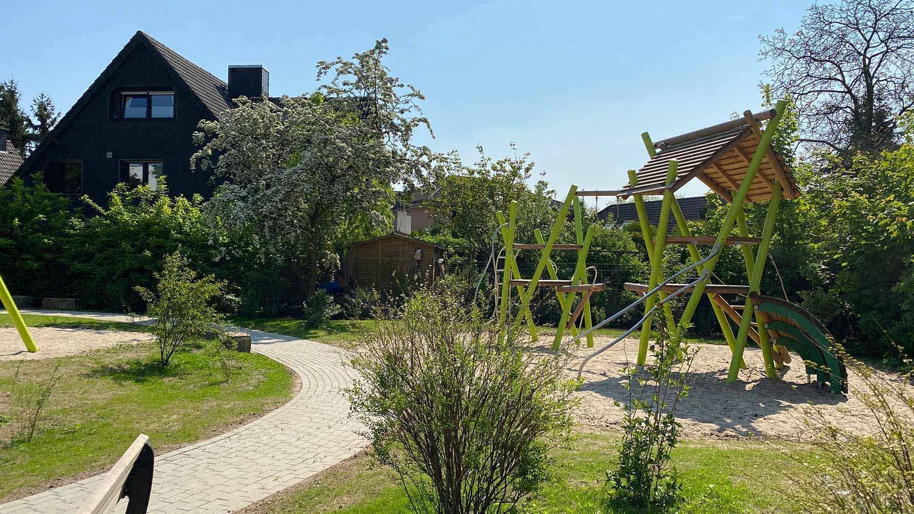 Im Rahmen der Entwicklung eines Neubaugebietes mit Zweifamilienhäusern und Reihenhäusern wurde ein öffentlicher Grünzug als „Trittbrett-Biotop“ mit Spielplatz und Erholungsmöglichkeiten geschaffen.